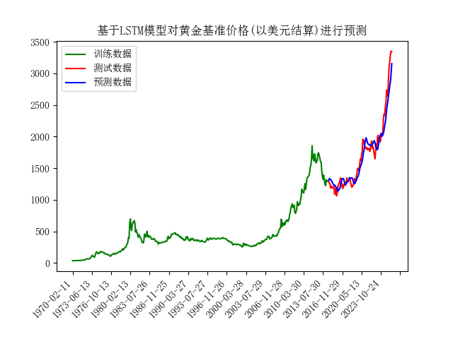 ax.set_title('基于LSTM模型对黄金基准价格(以美元结算)进行预测')
