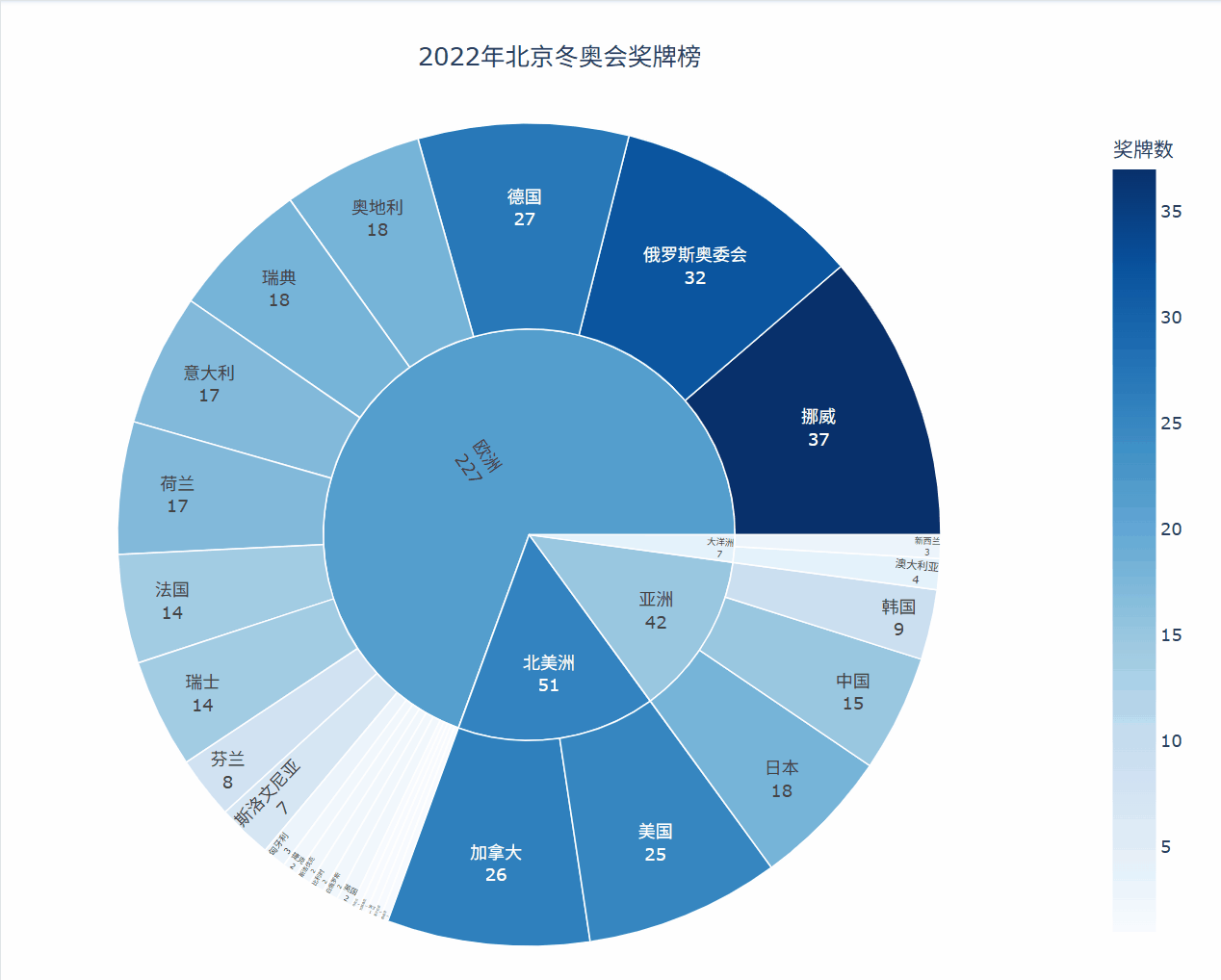 fig = px.sunburst(data, path=['洲', '国'], values='奖牌数', color='奖牌数', color_continuous_scale='blues',