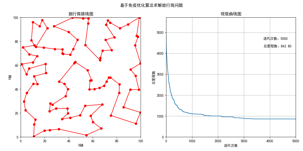 fig.suptitle('基于免疫优化算法求解旅行商问题')
