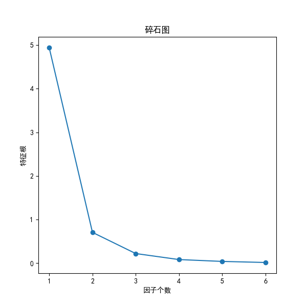 由上述结果可知,KMO值为0.81,大于0.6的阈值,通过了KMO检验;Bartlett检验的p值也趋近于0,通过了Bartlett检验。综上,可以做因子分析。