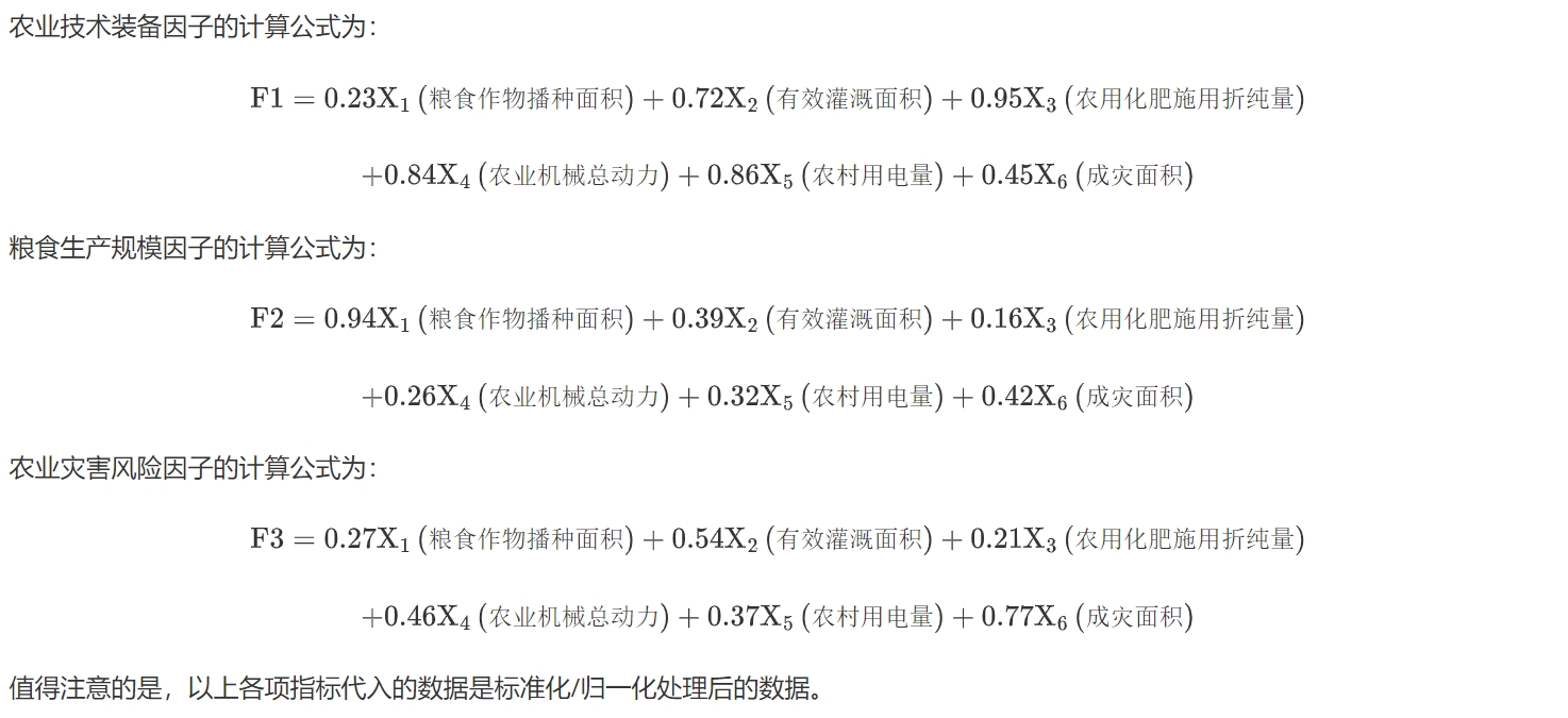 由于各指标的量纲不同(单位不一致),因此,需要对数据(除了因变量:粮食产量)进行标准化/归一化处理,输出结果如下: